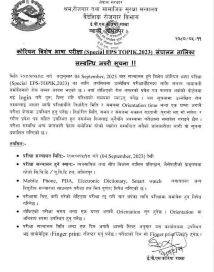 वैदेशिक रोजगार विभागको ई.पी.एस.शाखाले रोजगारीका लागि दक्षिण कोरिया जान चाहनेहरुसँग २०८० भदौ १८ गते ललितपुरको भैंसेपाटीस्थित व्यवसायिक तथा सीप विकास तालिम प्रतिष्ठानमा कोरियन भाषाको ई.पी.एस. परीक्षा लिने भएको छ । यस विषयको सूचना प्रकाशन गर्दै सो शाखाले यो परीक्षामा सामेल हुन चाहने परीक्षार्थीले उक्त परीक्षाको एक दिन अगावै सोही शाखा कार्यालयमा बायोमेट्रिक गराउनु पर्ने उल्लेख छ ।