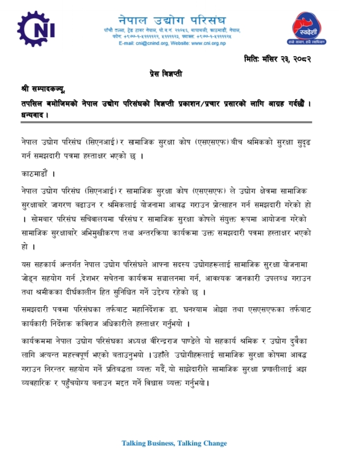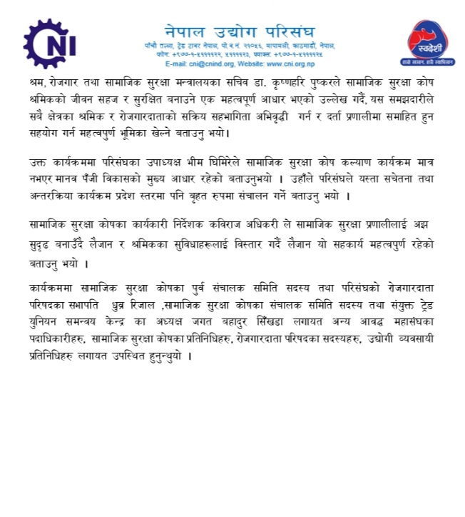 नेपाल उद्योग परिसंघ र सामाजिक सुरक्षा कोष बीच श्रमिकको सुरक्षा सुदृढ गर्ने सहझदारी भएको छ । २०८२ मंसीर २२ गते सो सहमती भएको नेपाल उद्योग परिसंघले जनाएको छ