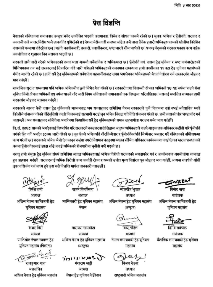 विभिन्न ११ वटा ट्रेड युनियनले सरकारले गरेको श्रमिकको तलव भत्ता बढाउने निर्णय अवैज्ञानिक र श्रमिकमारा रहेेको भन्दै सो नििर्णण सच्याई त्यसलाई श्रमिक मैत्री बनाउन माग गरेका छन् । उनीहरुले आज संंयुक्त प्रेस विज्ञप्ति जारी गरि श्रमिकहरुको हित विपरीतका ऐन नियम संशोधन गरी श्रमिक मैत्री बनाउन , श्रमिकको हित विपरीत कार्य हुन नदिन तथा सरकारी र निजी क्षेत्रका श्रमिकहरु बीचको सेवा सुविधामा भइरहेको विभेद हटाउन माग गरेका छन् ।