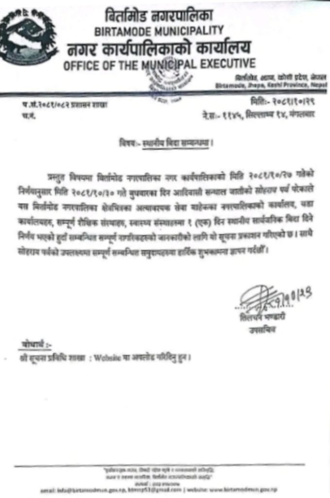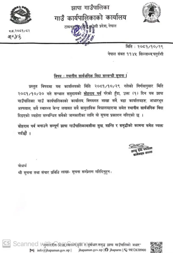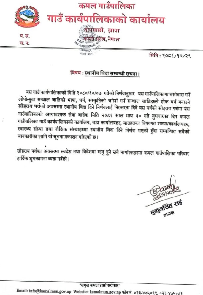 सन्थाल समदाय आज सोहराय पर्व मनाइरहेका छन् । झापाको विर्तामोड नगरपालिका, काल गाउँपालिका, झापा गाउँपालिका लगायतले सन्थाल जातिले मनाउने सोहराय पर्वको अवसरमा आज सार्वजनिक विदा दिएका छन् । अलग्गै शारीरिक बनौट तथा भाषा , भेषभुषा र संस्कृति भएको सन्थाल जातिको झापाका विभिन्न स्थानमा बसोबास रहेको छ । यो समुदायको ठूलो संख्याको आर्थिक अवस्था र शैक्षिक स्तर माथि उठ्न सकेको छैन ।