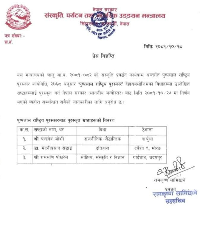नेपाल सरकार, संस्कृति, पर्यटन तथा नागरिक उड्डयन मन्त्रालयले यस वर्षको पुष्पलाल राष्ट्रिय पुरस्कार चन्द्रदेव जोशी, मेदनीप्रसाद सेढाई र राममणि पोखरेललाई प्रदान गर्ने भएको छ । यही माघ २७ गते मन्त्रीस्तरबाट सो निर्णय भएको बताइएको छ ।