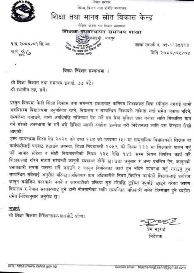 ऐन र नियम विपरित कार्य गर्न नदिन शिक्षा तथा मानव स्रोत विकास केन्द्र , सानोठिमी , भक्तपुरले ७७ वटै शिक्षा विकास तथा समन्वय इकाईलाई निर्देशन दिएको जनाएको छ । सामुदायिक विद्यालयका कतिपय शिक्षकले ऐन , नियम र आचरण विपरीतका कार्य गरेको गुनासो बढेकाले यो निर्देशन दिनु परेको बताइएको छ ।