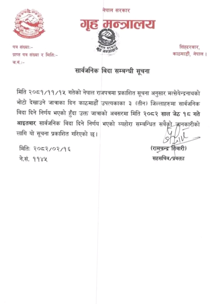 य‍ो जात्राको अवसरमा आज गृह मन्त्रालयमा काठमनडौं उपत्यकाका तीनवटै जिल्लामा सारवजनपक बिदा दिएको छ ।