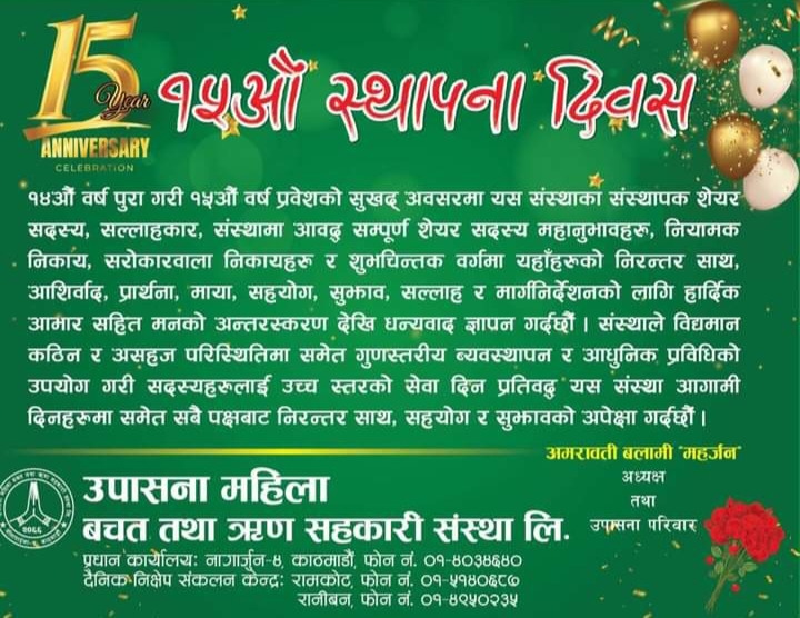 उक्त संस्थाको १५ स्थापना दिवसको अवसरमा एक अर्कामा शुभकामना आदान प्रदान गरिएको थियो ।