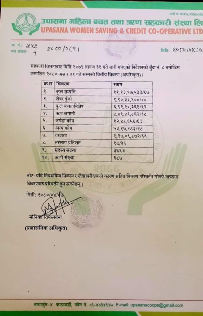 उपासना महिला बचत तथा ऋण सहकारी संस्था लि.ले गत असार ३० गते शनिबार काठमाडौंको छाउनीमा कार्यशाला ग‍‍ोष्टी आय‍ोजना गरि त्यहींबाट आर्थिक वर्ष २०८०/०८१ को आफ्नो नीति, कार्यक्रम र बजेट निर्माण कार्य गरेक‍ो बताइएको छ ।