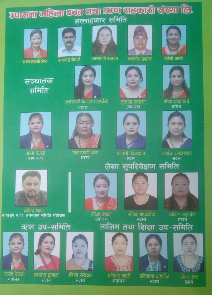 उक्त कार्यक्रमको अध्यक्षता गर्नु भएकी त्यसै संस्थाकी अध्यक्ष महर्जनले शेयर सदस्यहरु ज्यूहरुको योगदानका कारण हाम्रो यस उपासना महिला बचत तथा ऋण सहकारी संस्था लि.ले सहकारी क्षेत्रमा आफ्नो अलग्गै पहिचान बनाउन सफल भएको बताउनुभयो । हाम्रो यो संस्था सफलताका साथ अगाडि बढ्नुमा सस्थाका बचतकर्ता सदस्यहरु, ऋण लिएर समयमै ऋण तिर्ने सदस्यहरु र कमर्चारीहरुको महत्वपूर्ण योगदान रहेको भन्दै उहाँले सबैलाई धन्यबाद ज्ञापन गर्नुभयो ।