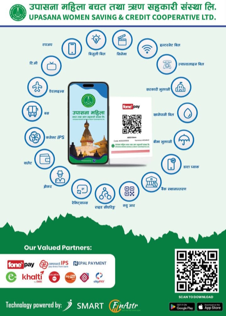 त्यसैगरी देवान सफ्ट प्रा.लि.का प्रतिनिधि विष्णु महर्जनले उपासना महिला बचत तथा ऋण सहकारी संस्था लि.ले सहकारीको पैसा बैंकमा र बैंकको पैसा सहकारी ट्रान्सफर गर्न मिल्ने गरी मोवाइल बैंकिङ सेवा सञ्चालनमा ल्याएकोले यस संस्थाका सदस्यहरुले घरैमा बसेर यो मोबाइल बैंकिङ सेवा मार्फत बिजुली, इणेटरनेट, खानेपानी आदिको विल भुक्तानी गर्न सक्ने बताउनुभयो । उहाले चाडै नै यो संस्थाले व्यवसायिक क्युआर कोड सञ्चालन लयनउन लागेको बताउनुभयो ।