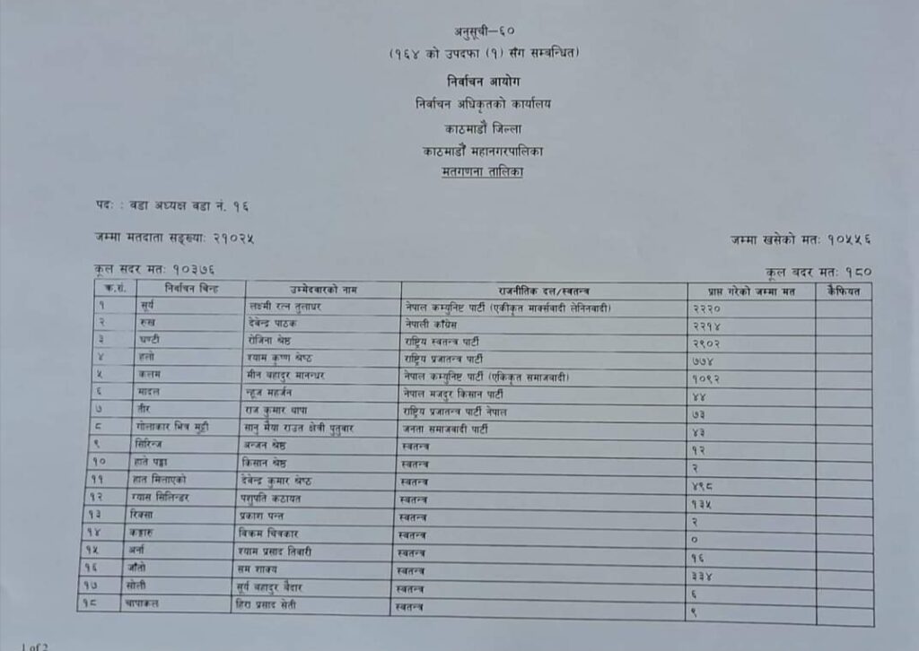 त्यस्तै यस अघि नेपाली कांग्रेसले २०७४ र २०७९ को निर्वाचनमा जितेको काठमाडौं महानगरपालिका वडा नं.१६ को वडाध्यक्षमा रास्वपाकी रोजिना श्रेष्ठले ६८२ मतान्तरले बाजी मारिन् । उनले २,९०२ मत ल्याउदा उनका निकटतम प्रतिस्पर्धीहरु नेकपा (एमाले)का लक्ष्मीरत्न तुलाधरले २,२२० , नेपाली कांग्रेसका देवेन्द्र पाठकले २,२१४ र नेकपा (एस)का मीनबहादुर मानन्धरले १,०९२ मत पाए ।