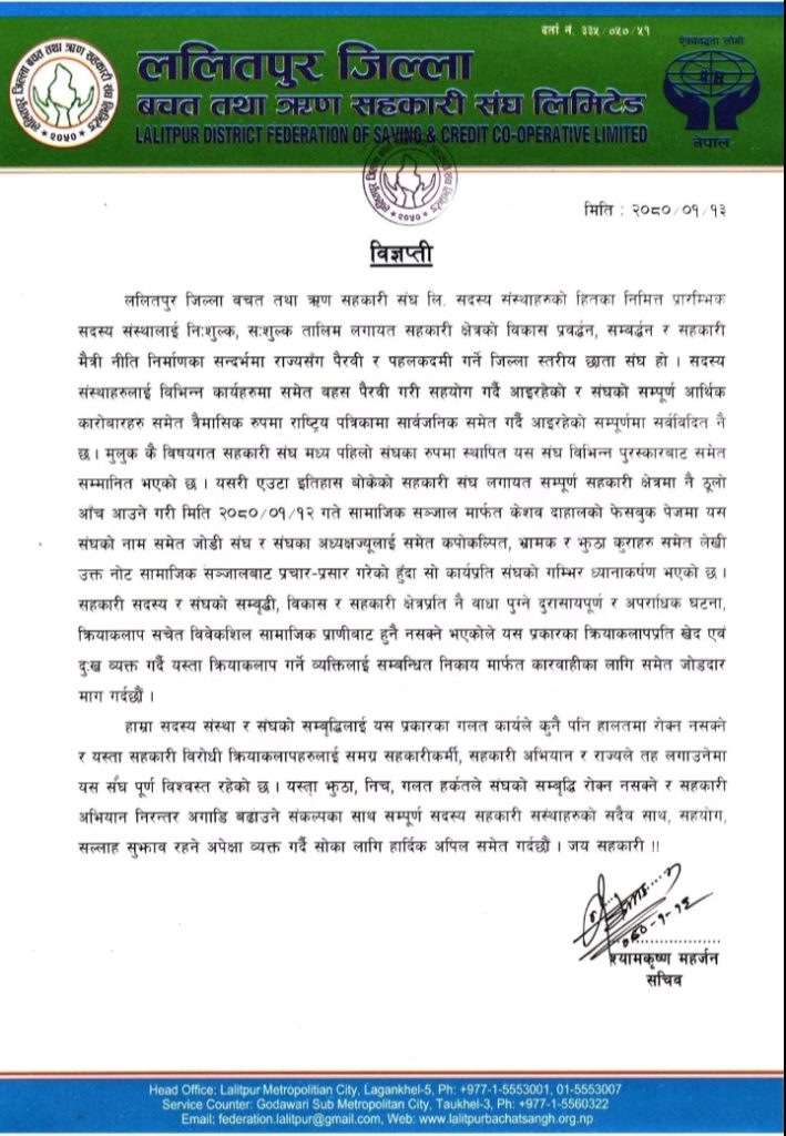 ललितपुर जिल्ला बचत तथा ऋण सहकारी संघ लि. र सोही संघका अध्यक्ष विरुद्ध भ्रामक, झुटो र कपोलकल्पित प्रचार गरिएको भन्दै त्यसको सो संघले भत्सर्ना गरेेको छ । उक्त संघका सचिव श्यामकृष्ण महर्जनले प्रेस विज्ञप्ति जारी गरि यस्ता भ्रामक , झुटा र कपोलकल्पित प्रचारमा सम्लग्न व्यक्तिलाई कडा कारबाही गर्न सरकारलाई अनुरोध गर्नु भएको छ । नेपालकै पुरानो सहकारी संघको रुपमा रहेको ललितपुर जल्ला बचत तथा ऋण सहकारी संघ लि. आफना सदस्य संस्थाहरुलाई नि:शुल्क र स:शुल्क तालिम प्रदान गर्नुका साथै सहकारीको विकास, प्रवर्द्धन र सम्बर्द्धनका लागि निरन्तर काम गरिरहेको त्यस प्रस विज्ञप्तिमा उल्लेख छ ।