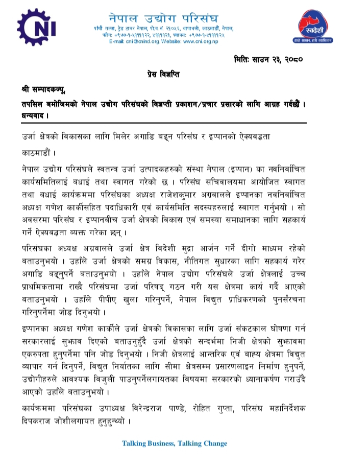 नेपाल उद्योग परिसंघ र स्वतन्त्र उर्जा उत्पादकहरुको संस्था नेपाल (इप्पान) उर्जा क्षैत्रको विकास र समस्या समाधानका लागि मिलेर अगाडि बढने भएका छन् । स्वतन्त्र उर्जा उत्पादकहरुको संस्था नेपाल (इप्पान) का नवनिर्वाचित कार्यसमितिका पदाधिकारी तथा सदस्यहरुलाई बधाई तथा स्वागतका लागि २०८० श्रावण २३ गते मंगलबार आफ्नै सचिवालयमा नेपाल उद्योग परिसंघले आयोजना गरेको स्वागत तथा बधाई कार्यक्रममा उनीहरुले सो ऐक्यबद्धता जनाएको बताइएको छ ।
