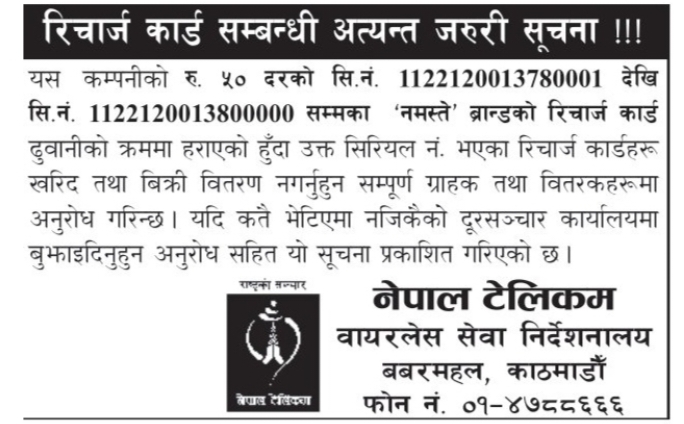 नेपाल टेलिकमको ५० रुपैया दरका रिचार्ज कार्ड हराएको बताइएको छ । नेपाल टेलिकमले जारी गरेको सूचनामा सो कम्पनीका सि.नं. ११२२१२००१३७८०००१ देखि ११२२१२ ००१३८००००० सम्मका नमस्ते ब्राण्डका रिचार्ज कार्ड ढुवानीको क्रममा हराएको उल्लेख छ