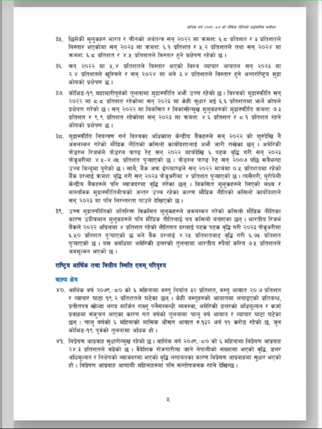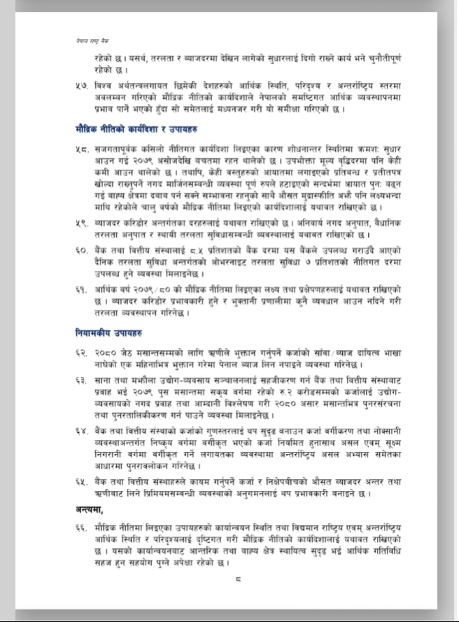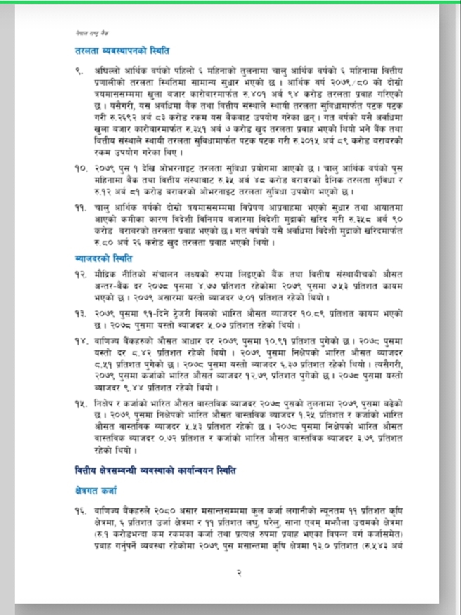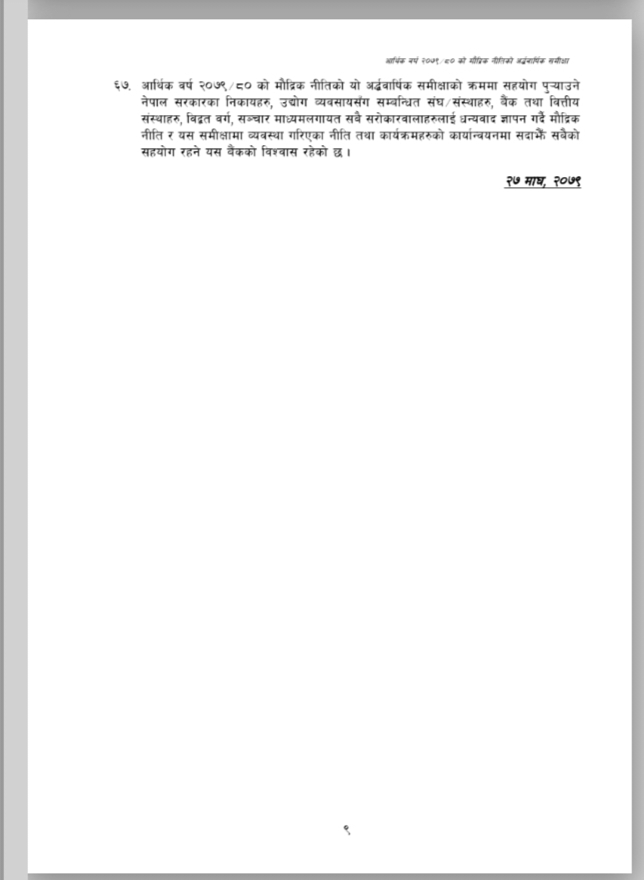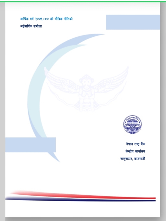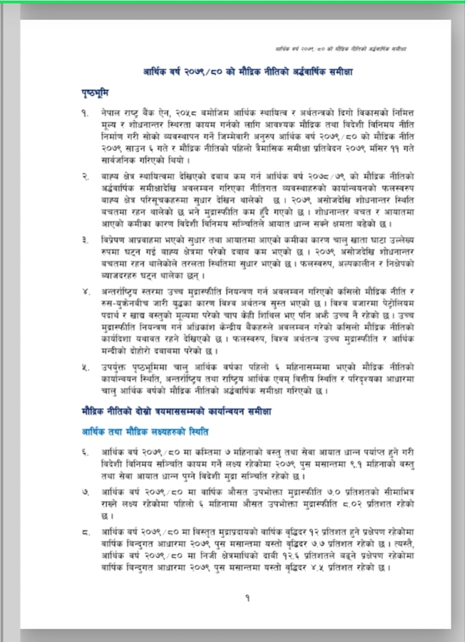 नेपाल राष्ट्र बैंकले आर्थिक वर्ष २०७९/०८० को मौद्रिक नीतिको अर्ध-वार्षिक समीक्षा आज सार्वजनिक गरेको छ । उक्त अर्ध-वार्षिक समीक्षामा चालु आर्थिक वर्षको ६ महिनामा उपभोक्ता मुद्रस्फीर्ति ८.०२ प्रतिशत पुगेको उल्लेख छ । त्यस्तै गत पुस मसान्तसम्म ९.१ महिनाको लागि बस्तु तथा सेवा खरीद गर्न पुग्ने विदेशी मुद्रा सञ्चिती रहेको उल्लेख छ । उक्त अर्ध-वार्षिक समीक्षा यस प्रकार छ ।