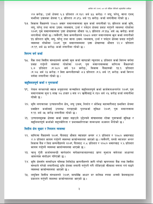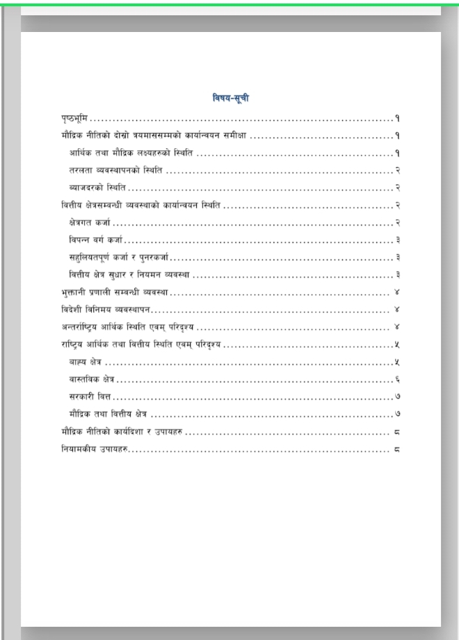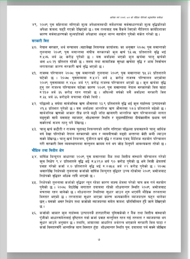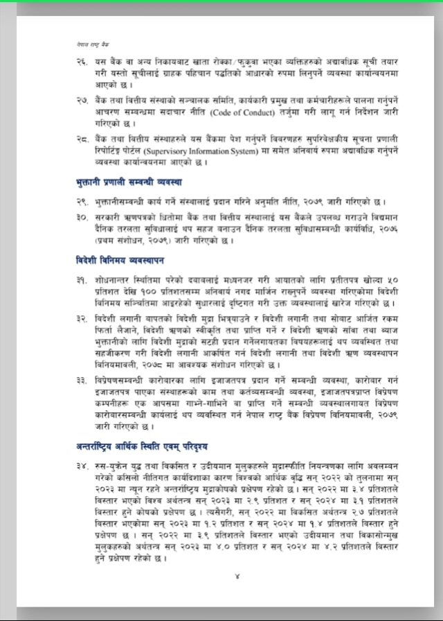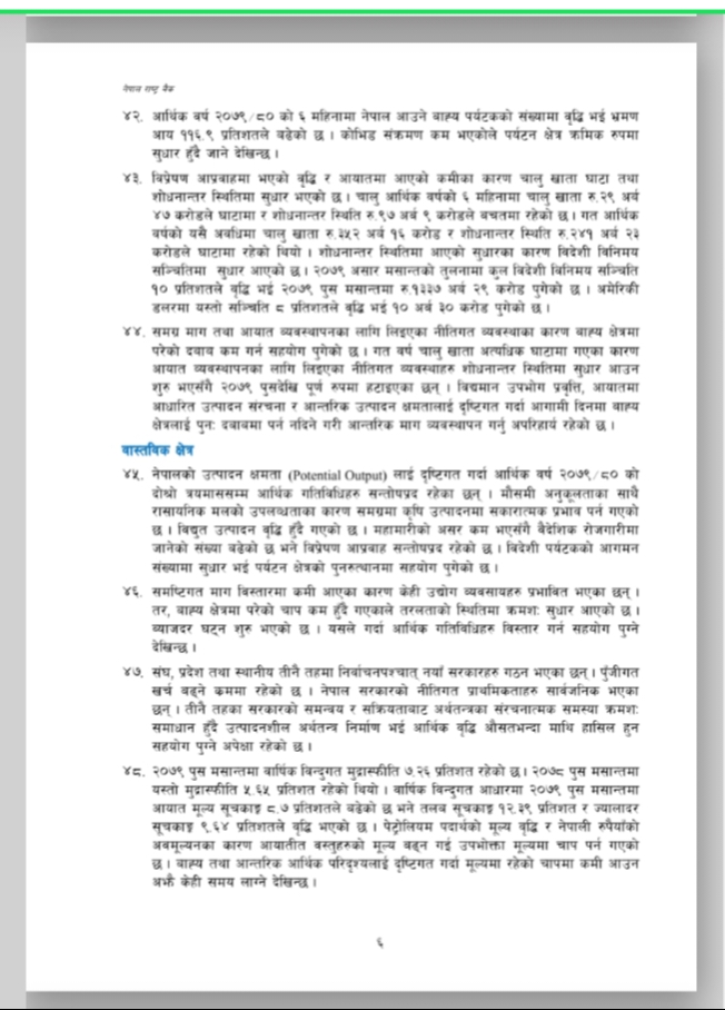 नेपाल राष्ट्र बैंकले आर्थिक वर्ष २०७९/०८० को मौद्रिक नीतिको अर्ध-वार्षिक समीक्षा आज सार्वजनिक गरेको छ । उक्त अर्ध-वार्षिक समीक्षामा चालु आर्थिक वर्षको ६ महिनामा उपभोक्ता मुद्रस्फीर्ति ८.०२ प्रतिशत पुगेको उल्लेख छ । त्यस्तै गत पुस मसान्तसम्म ९.१ महिनाको लागि बस्तु तथा सेवा खरीद गर्न पुग्ने विदेशी मुद्रा सञ्चिती रहेको उल्लेख छ । उक्त अर्ध-वार्षिक समीक्षा यस प्रकार छ ।