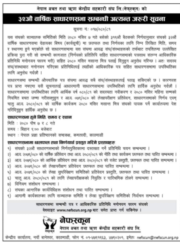 नेपाल बचत तथा ऋण केन्द्रीय सहकारी संंघ लि.को ३२औँ वार्षिक सााधारण सभा आगामी पुस ७ र ८ गते काठमाडौंको कमलादीस्थित नेपाल प्रज्ञा प्रतिष्ठानमा हुने भएको छ । यो साधारण सभाबाट नेफ्स्कूनको नयाँ सञ्चालक समिति र लेखा सुपरीवेक्षण समिति पनि चयन हुने भएकोले यस साधारण सभालाई निकै चासोका साथ हेरिएको छ । नेफ्स्कूनको भावी अध्यक्षका लागि यसबेलासम्म बर्तमान अध्यक्ष परितोष पौड्याल र बरिष्ठ उपाध्यक्ष चन्द्रप्रसाद ढकाल आकाङ्क्षी देेखिनुभएको छ ।