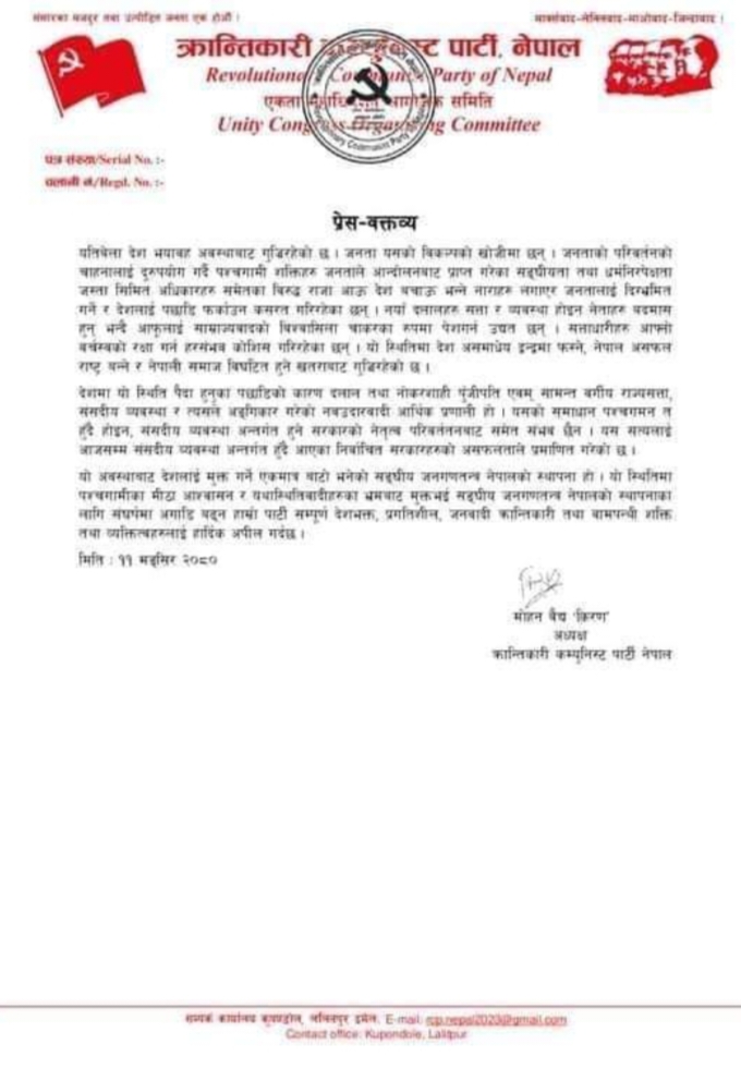 मोहन वैैद्य ‘किरण’ नेेतृत्वको क्रान्तिकारी कम्युनिष्ट पार्टी नेपालले पश्चगामीहरुका मिठा आश्वासन र यथास्थितिवादीहरुको भ्रमबाट मुक्त भई संघीय जनगणतन्त्र स्थापनाको दिशामा अगाडि बढ्न आग्रह गरेको छ । स पार्टीद्वारा जारी प्रेस विज्ञप्तिमा सो कुरा उल्लेख छ ।