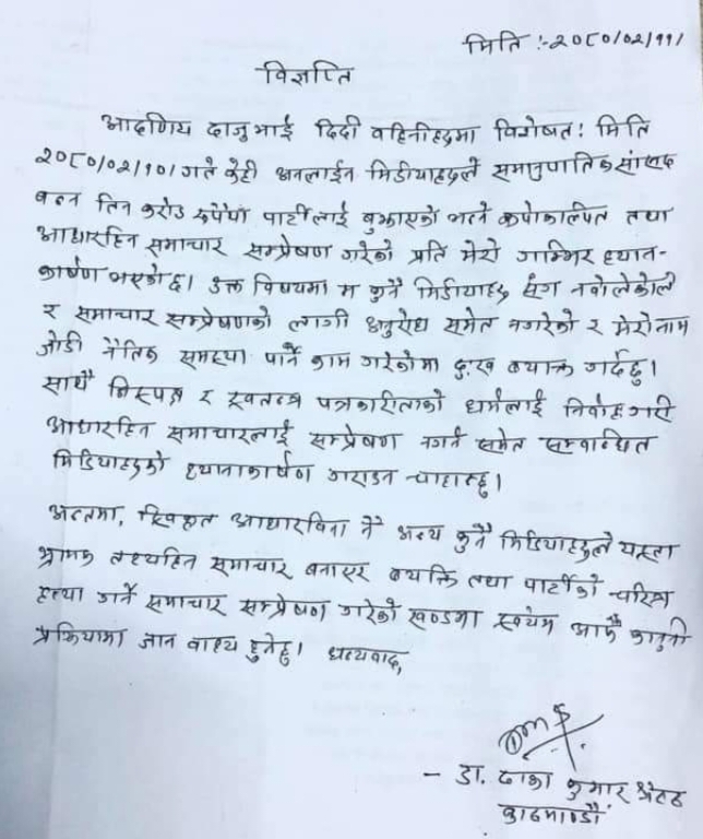 डा.ढाकाकुमनर श्रेष्ठले सांसद बन्न रास्वपाका नेताहरुलाई रु.२ कर‍ड ८४ लाख बुझाएको भनेको भन्ने विषयको समाचार प्रकाशन भएको थियो । यही समाचारको विषयलाई लिएर रास्वपाका नेताहरुले सो पार्टीबाट निस्काशित सांसद डा.ढाकाकुमार श्रेष्ठ विरुद्ध अदालतमा मानहानीको मुद्धा दर्ता गर्ने भनेको विषयको समाचार पनि सञ्चार माध्यममा प्रकाशन भएको प्रकाशन भएको थियो ।