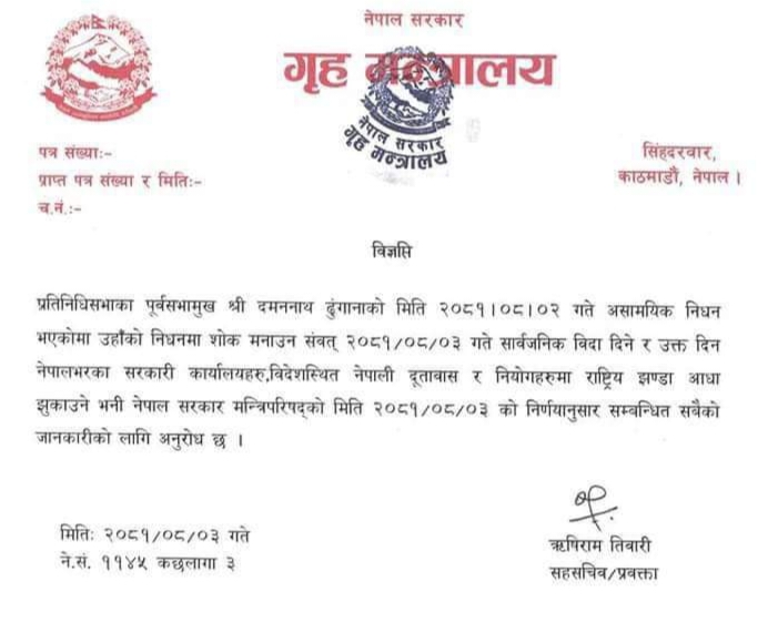 दिवंगत ढुंगानाको पार्थिव शरीर आजै अपरान्ह पशुपति आर्यघाटमा राजकीय सम्मानका साथ अन्तेष्टि गर्ने जनाइएको छ । नेपाल सरकार, मन्त्रीपरिषदकोआज विहान बसेको बैठकले दिवंगत ढुंगानाको निधनको शोकमा सार्वजनिक बिदा दिने र उहाँको पार्थिव शरीर राजकीय सम्मानका साथ अन्तेष्टि गर्ने निर्णय गरेको थियो ।