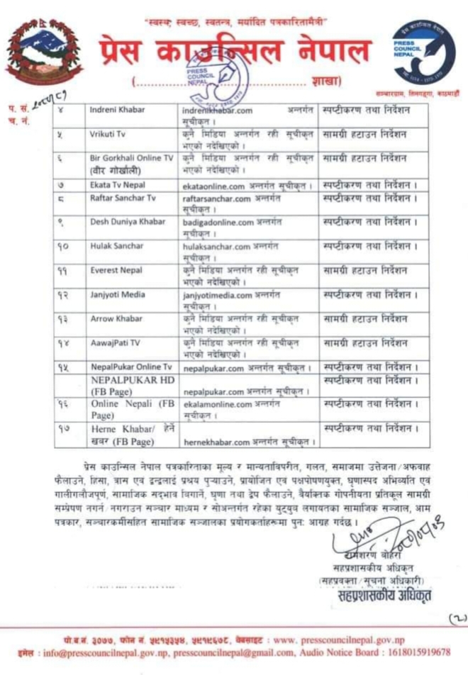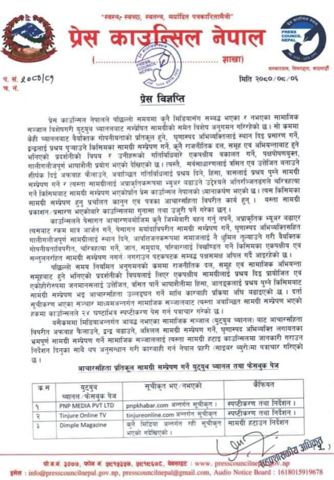 सामाजिक सद्भाव भड्काउने र वैयक्तिक ग‍ोपनियतामा अशर गर्ने सामाग्री अतिरञ्जित गरी प्रशारण /प्रकाशन गरेको भन्दै प्रेस काउन्सिल नेपालले १७ वटा युटुव च्यानल/फेसबुक पेजलाई कारवाही गरेको जनाएको छ । प्रेस काउन्सिल नेपालले जारी गरेको प्रेस विज्ञप्तिमा १२ वटा युटुव/फेसबुक पेजलाई स्पष्टीकरण तथा निर्देशन र ५ वटा युटुव /फेसबुक पेजका सामाग्री हटाउन निर्देशन दिएको उल्लेख छ ।