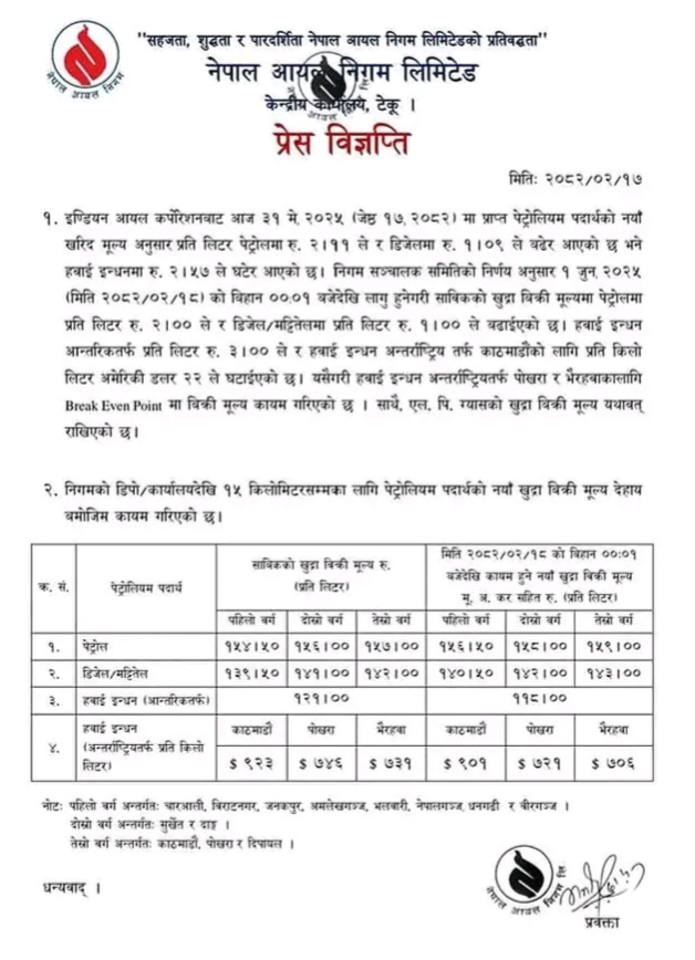 गएरातीबाट पेट्रोल, डिजेल र मट्टितेलको मूल्य बढेको छ तर हवाई इन्धनको मूल्य घटेको छ । नेपाल आयल निगम लि.को सञ्चालक समितिको शनिबार बसेको बैठकले साविक खुद्रा मुल्यमा पेट्रोलमा प्रति ली.मा रु.२,डिजेल र मट्टितेलमा प्रति ली.मा रु.१ बढाएको छ तर हवाई इन्धन आन्तरिकतर्फ प्रति ली.मा रु.३ र हवाई इन्धन अन्तर्राष्ट्रियतर्फ काठमाडौंका लागि प्रतिकिलोलीटरमा २२ घटाउने निर्णय गरेको जनाइएको छ । खाना पकाउने एल.पी. ग्यासको मूल्य भने यथावत रहेको बताइएको छ ।