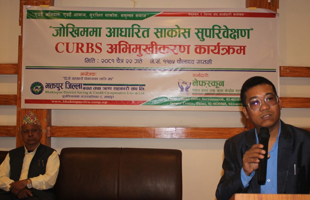 भक्तपुर जिल्ला बचत तथा ऋण सहकारी संघ लि.को आयोजना र नेपाल बचत तथा ऋण केन्द्रीय सहकारी संघ लि.को साझेदारी कार्यक्रम अन्र्तगत जोखिममा आधारित साकोस सुपरीवेक्षण( Credit union Risk Based Supervision-CURBS) सम्बन्धी अभिमुखीकरण कार्यक्रम २०८१ चैत्र २२ गते शुक्रबार रोयल थाई हस्पिटालिटी, राधेराधेमा सम्पन्न भयो । कार्यक्रमको उद्घाटन भक्तपुर जिल्ला बचत तथा ऋण सहकारी संघ लि.का कोषाध्यक्ष कान्छाभक्त घजुले गर्नुभयो । सो अवसरमा उहाँले सहकारी संस्था स्तरीकरण कार्यक्रममा आवद्ध हुँदा संस्थालाई नीति नियम विपरीत जान दिदैन र संस्थाको वित्तीय पाटोको बारेमा सुक्ष्म विश्लेषण हुने विचार व्यक्त गर्नुभयो । उहाँले संस्थाको सञ्चालक समितिको नियमित बैठकमा मासिक रुपमा पल्र्स सहित वित्तीय अवस्था पेश गरी सोको बारेमा गहन छलफल गर्नुपर्ने बताउनुभयो । साथै नेपाल सरकारले जारी गरेको सहकारी ऐन र नेपाल राष्ट्र बैंकले जारी गरेको मापदण्डमा फरक फरक व्यवस्थाले सहकारी संस्था अन्यौलतामा रहेको बताउनुभयो ।