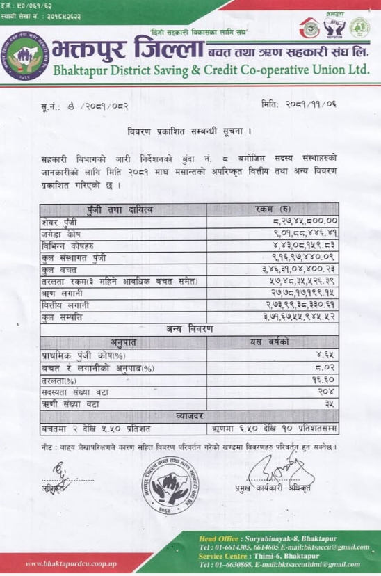 भक्तपुर जिल्ला बचत तथा ऋण सहकारी संघ लि.,भक्तपुरको अर्ध-बार्षिक समीक्षा २०८१ फागुण १० गते शनिबार केभि लञ्ज कमलविनायक, भक्तपुरमा सम्पन्न भयो । सोही संघका अध्यक्ष