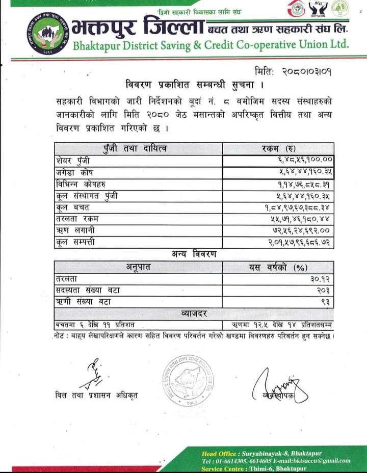 कार्यक्रममा त्यसै संघका व्यवस्थापक बालकृष्ण धोंजुले यस संघले अन्तर-लगानी, शिक्षा तथा तालिम र अभियान गरी मुख्य तीन क्षेत्रमा काम गर्दै आएको बताउनुभयो । उहाँले २०८० जेष्ठ मसान्तसम्ममा यस संघमा २ अर्ब १ करोड रुपैया कूल सम्पत्ति तथा दायित्व रहेको प्रगति विवरण समेत प्रस्तुत गर्नुभयो ।