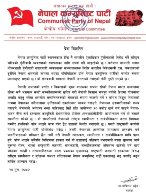 नेपाल कम्युनिष्ट पार्टीका अध्यक्ष ऋषिराम कट्टेललेेे भारत र नेपालका परराष्ट्र मन्त्रीको उपस्थितिमा यही पुस २० गते भारतीय दूताबासले रु २० करोडसम्म परियोजनाहरुमा सिधै खर्च गर्न पाउने गरि भएको सहमती नेपालको हित विपरीत रहेको भन्दै त्यसको विरोधब गर्नुभएक छ । उहाँले जारी गर्नुभएको प्रे्स विज्ञप्तिमा परियोजना निर्माणको नाममा भारतले नेपालका नदीनाला कब्जा गरेको भन्दै नेपालको हित विपरीतका सबै असमान सन्धि सम्झौता खारेज गर्नु पर्ने बताउनुभएको छ ।