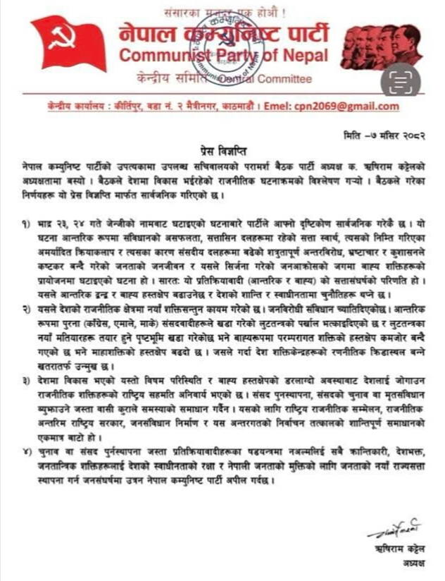 नेपाल कम्युनिष्ट पार्टीले मुलुकमा विद्यमान समस्याको निकास राष्ट्रिय राजनीतिक सम्मेलनबाट मात्र हुन सक्ने धारणा सार्वजनिक गरेको छ । नेपाल कम्युनिष्ट पार्टीका अध्यक्ष ऋषिराम कट्टेलले सो पार्टीको सचिवालयको परामर्श बैठकको निर्णय सार्वजनिक गर्न जारी गर्नु भएको प्रेस विज्ञप्तिमा संसद पुनर्स्थापना, संसदको चुनाव वा मृत संविधान व्युझाउने जस्ता बासी कुराले समस्याको समाधान गर्दैन भन्नुभएको छ । देशमा विकास भएको विषम परिस्थिति र बाह्य हस्तक्षेपको डर लाग्दो अवस्थाबाट देशलाई जोगाउन राजनीतिक शक्तिहरुको राष्ट्रिय सहमती अपरिहार्य भएको धारणा व्यक्त गर्दै अध्यक्ष कट्टेलले ‘राष्ट्रिय राजनीतिक सम्मेलन, राजनीतिक अन्तरिम राष्ट्रिय सरकार, जनसंविधान निर्माण र यश अन्तर्गतको निर्वाचन तत्कालको समस्याको शान्तिपूर्ण समाधानको एक मात्र बाटो हो’, भन्नुभएको छ । एक प्रसङ्गमा उहाँले हामीले हाम्रा दुबै छिमेकी देशसँग समसामिप्यतामा रहेर अगाडि बढ्ने गरि हाम्रो देशको परराष्ट्र नीति निर्माण गर्नु पर्ने अलगपथलाई बताउनुभयो ।
