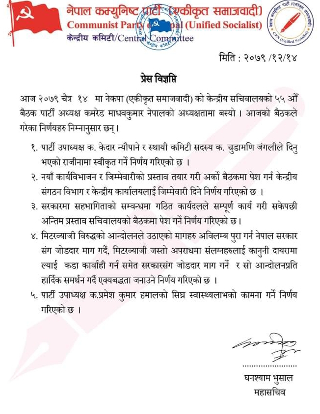 यसैगरी सो पार्टीले उपाध्यक्ष केदार न्यौपाने र स्थायी कमिटी सदस्य चुडामणि जंगलीको राजीनामा स्वीकृत गरेको उक्त पार्टीले जनरी गरेको विज्ञप्तिमा उल्लेख छ ।