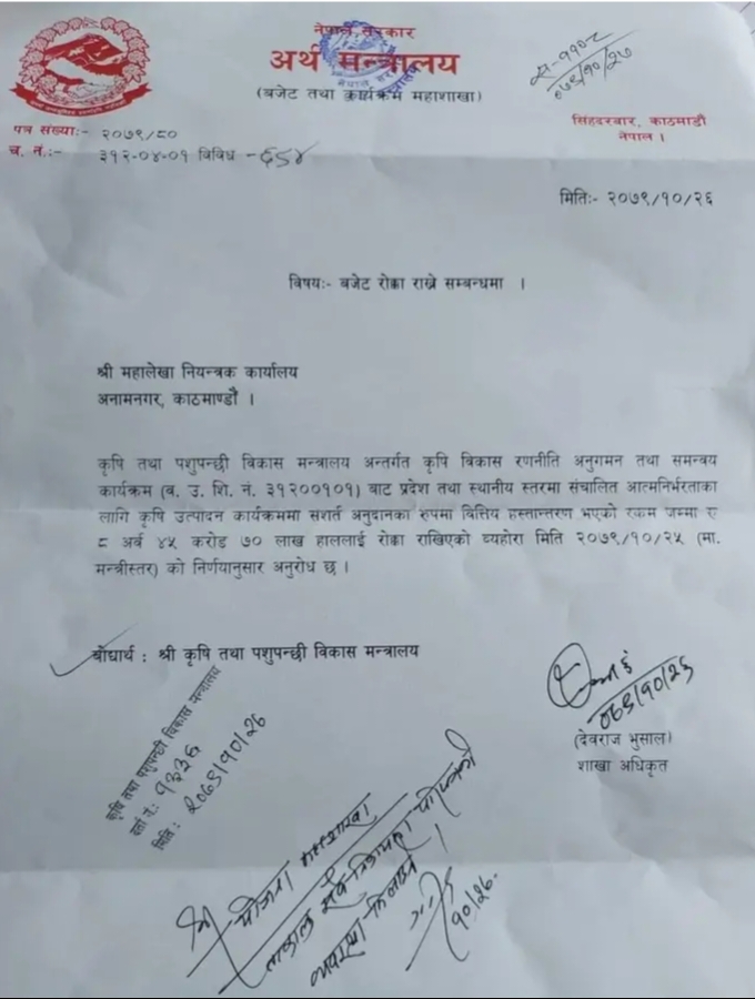 अर्थ मन्त्रालयले कृषि तथा पशुपञ्छी विकास मन्त्रालय मार्फय प्रदेश र स्थानीय तह मार्फत शसर्त प्रदान गरिने अनुदान रकम रोक्का गरेको जनाएको छ । सो मन्त्रालयले महालेखा नियन्त्रक कार्यालय, अनामनगर , काठमाडौंलाई लेखेको पत्रमा सो कुरा उल्लेख छ ।
