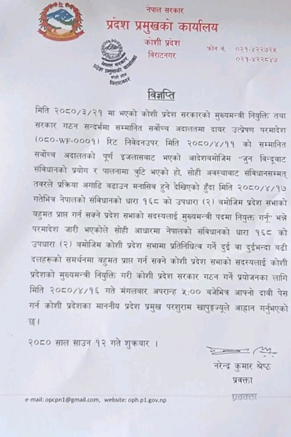 कोशी प्रदेश प्रमुख परशुराम खापुङद्वारा नेपालको संविधान, २०७२ को धारा १६८ को उपधारा २ अनुसार २ वा २ भन्दा बढी दलको समर्थनमा कोशी प्रदेश सभामा बहसमत प्रनप्त गर्न सक्ने सदस्यलाई यही श्रावण १६ गते अपरान्ह ५ बजे भित्र कोशी प्रदेश सरकारको मुख्यमन्त्री दावी प्रस्तुत गर्न आह्वान गर्नुभएको छ । कोशी प्रदेश प्रमुखको कार्यालयबाट आज जारी विज्ञप्तिमा उल्लेख छ ।