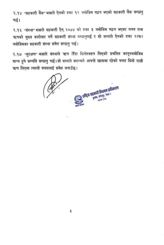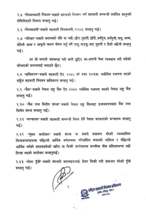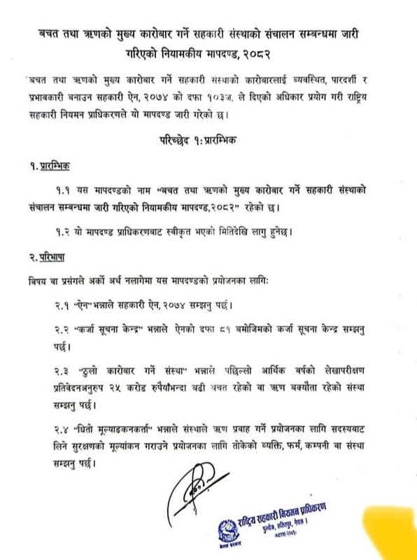 राष्ट्रिय सहकारी नियमन प्राधिकरणले बचत तथा ऋणको मुख्य कारोबार गर्ने सहकारी संस्थाको सञ्चालन सम्बन्धी जारी गरिएको नियामकीय मापदण्ड,२०८२ जारी गरेको छ । शुक्रबार बसेको सो प्राधिकरणको बैठकले स्वीकृत गरी उक्त निर्णय गरेको जनाइएको । यो मापदण्डमा “ठूलो कारोकार गर्ने संस्था”भन्नाले पछिल्लो आर्थिक वर्षको लेखापरीक्षण प्रतिवेदन अनुसार रु.२५ करोड भन्दा बढी बचत वा ऋणको बक्यौता रहेको संस्था सम्झनुपर्छ भन्ने उल्लेख छ ।