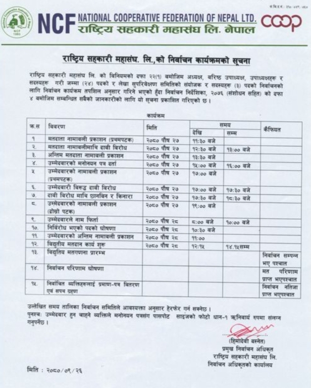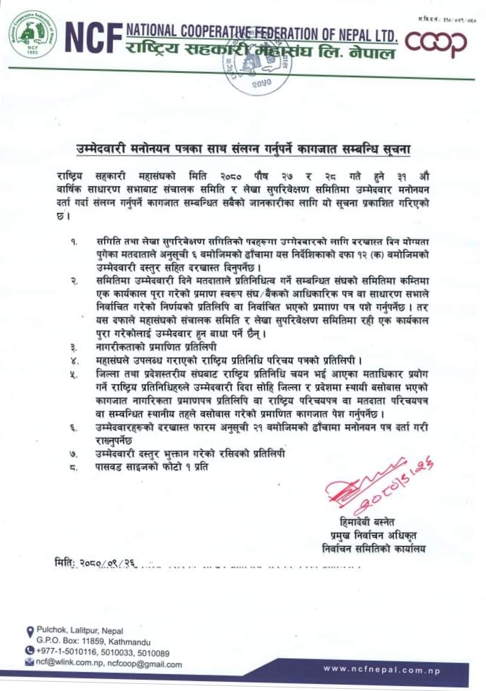 देशभरका सहकारी संंघ/संस्थाहरुको छाता संगठन राष्ट्रिय सहकारी महासंघ लि.,नेपालको निर्वाचन सहितको ३१औँ वार्षिक साधारण सभा ललितपुरको पुल्चोकस्थित सोही महासंघको भवनमा आजबाट शुरु हुँदै छ । भोलि सम्पन्न हुुने उक्त सााधारण सभाले सोही महासंघको १ अध्यक्ष, १ बरिष्ठ उपाध्यक्ष, कम्तीमा १ महिला सहित ३ उपाध्यक्ष र ७ महिला सहित १९ सदस्य गरी २४ सदस्यीय सञ्चालक समिति र कम्तीमा १ महिला सहित ३ सदस्यीय लेेखा सुपरीवेक्षण समिति चयन गर्ने जनाइएको छ । निर्वाचन उपसमितिका अनुसार ९ खुल्ला सदस्यमा कम्तीमा ५ जना महिला सदस्य तथा ७ प्रदेशमध्ये बागमती र लुम्बिनी प्रदेशबाट पनि कम्तीमा १/१ जना महिला सदस्य अनिवार्य गरिएको छ । साधारण सभामा निर्वाचनका लागि कोशी प्रदेशबाट ५८ , मधेश प्रदेशबाट ३०, बागमती प्रदेशबाट ८८, गण्डकी प्रदेशबाट ३७, लुम्बिनी प्रदेशबाट ३७, कर्णाली प्रदेशबाट १४ र सुदूरपश्चिम प्रदेशबाट २३ गरी २८७ जना केन्द्रीय प्रतिनिधि कायम गरिएको छ निर्वाचन उपसमितिले जनाएको छ । यो महासंघमा ३१८ सदस्य संघहरु आवद्ध रहेको बताइएको छ ।