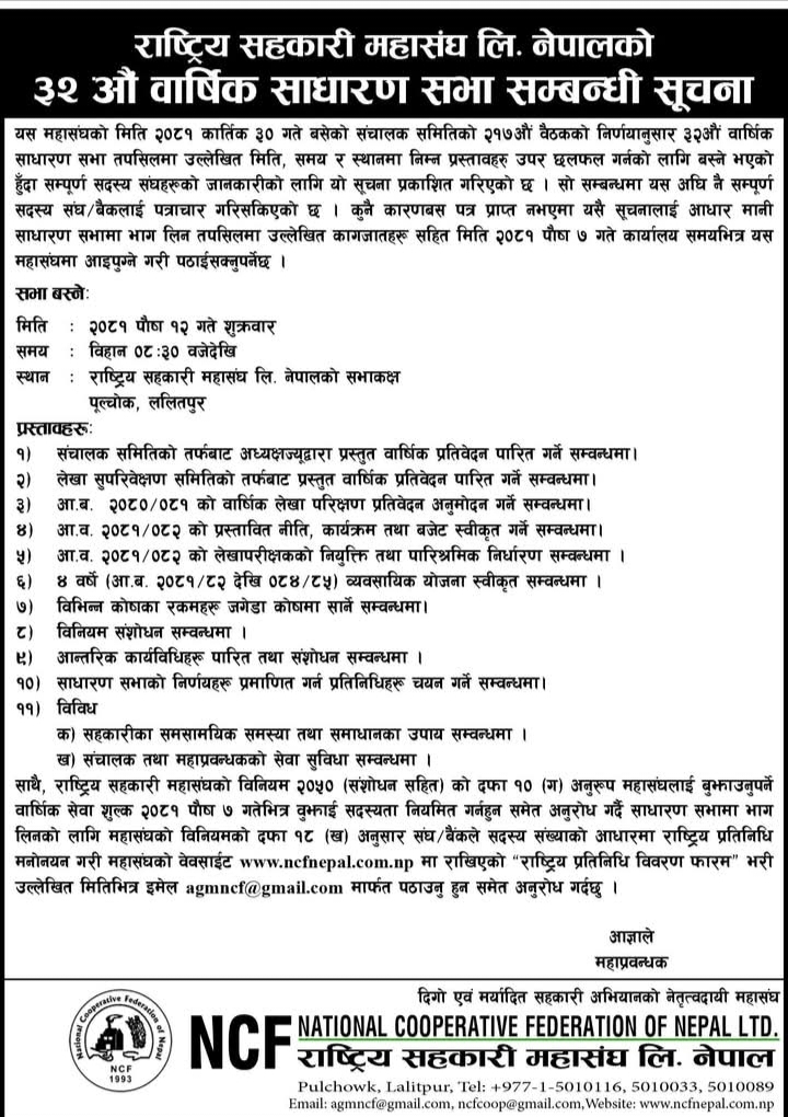 देशभरका सहकारी संघ/संस्थाहरुको छाता संगठन राष्ट्रिय सहकारी महासघ लि.,नेपालको ३२औं वार्षिक साधारण सभा आउदो पौष १२ गते शुक्रबार विहान ८:३० बजे ललितपुरको पुल्चोकस्थित आफ्नै कार्यालयको सभा हलमा हुने भएको छ । सो महासंघले सूचना जारी गरी उक्त विषयको जानकारी दिएको छ ।