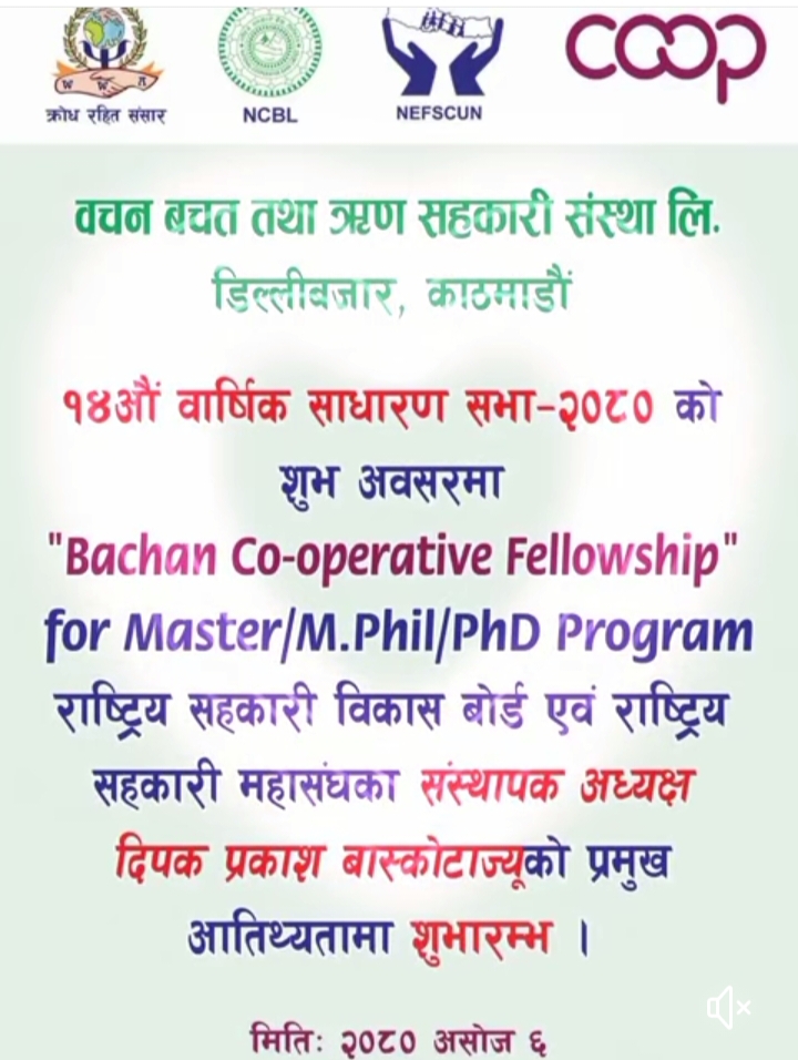 काठमाडौं महानगरपालिका-३०, डिल्लीबजारमा रहेको वचन बचत तथा ऋण सहकारी संस्था लि.को १४औँ वार्षिक साधारण सभा आज हुदैछ । सहकारी सिद्धान्त, मुल्य , मान्यता र आफ्नो शेयर सदस्यहरुको मर्म र भावनालाई आत्मसाथ गरी अगाडि बढिरहेको यो संस्थाको सो साधारण सभाको उद्घाटन पूर्व गृह राज्यमन्त्री एवं राष्ट्रिय सहकारी महासंघ लि.,नेपालका पूर्व अध्यक्ष दीपकप्रकाश बास्कोटाले गर्ने कार्यक्रम रहेको जनाइएको छ ।