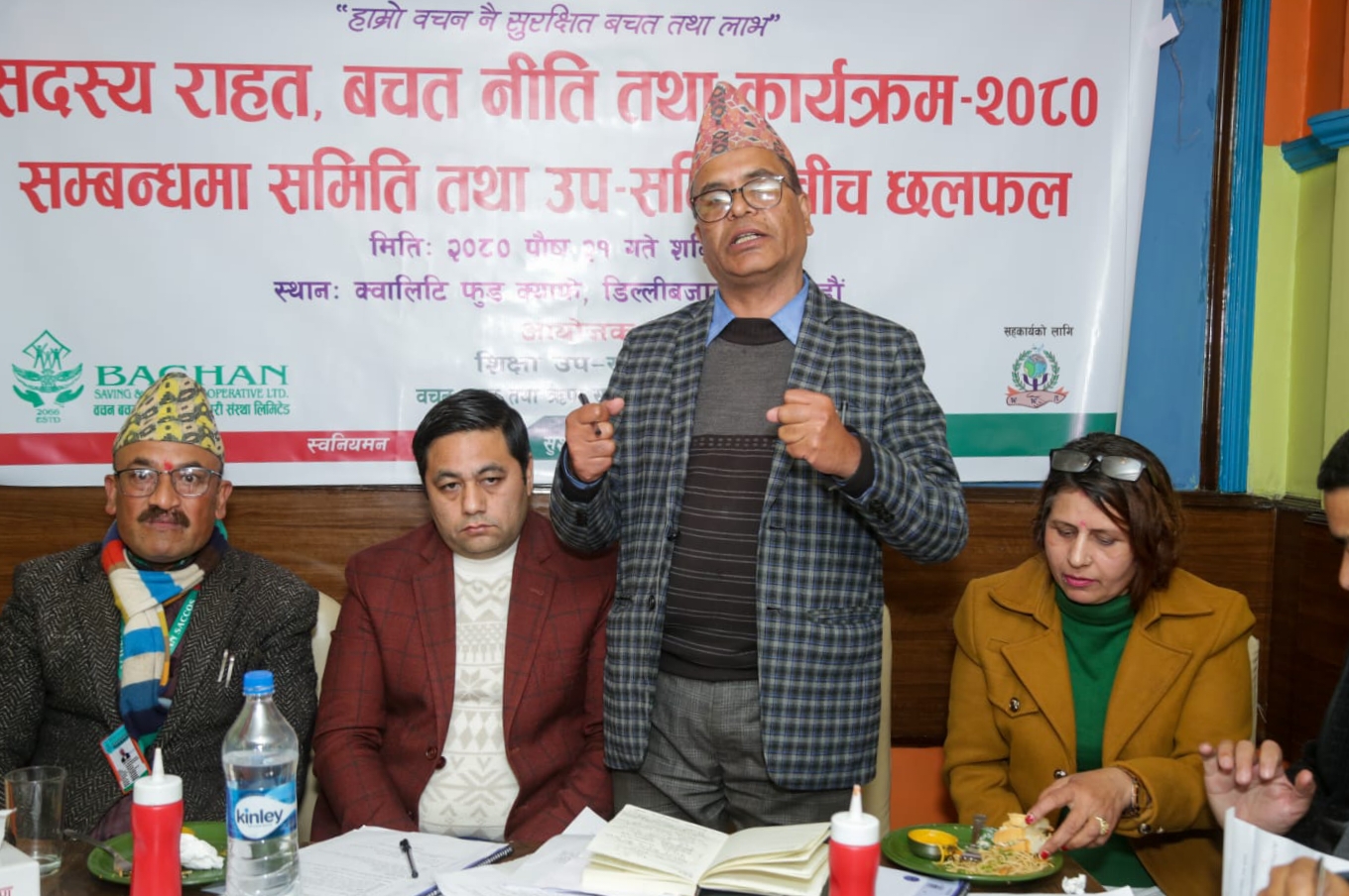 उक्त संंस्थाका शिक्षा उप-समिति सदस्य कृष्णप्रसाद डंगोलले सञ्चालन गर्नुभएको त्यस कार्यक्रममा सो संस्थाका प्रबन्ध निर्देशक डा.देशमर्दन बस्न्यातले संस्थाको सदस्य राहत नीति तथा कार्यक्रम बारे प्रकाश पार्दै ‘हालको सहकारीको अवस्थालाई नियाल्दा सहकारी सिद्धान्त , मूल्य , मान्यता र आचारसंहिता अनुसार दैनिक रुपमा गरिने कार्यहरु सञ्चालन गर्न नसक्नु , सदस्यको उन्नति , सामाजिक ,सांस्कृतिक तथा आर्थिक क्रियाकलाप अनुरुप कार्य गर्नु पर्नेमा यसलाई आ-आफ्नै तथ्य र विधिबाट प्रयोग गरेको हुनाले सहकारीमा उतारचढाव आएको देखिन्छ’, भन्नुभयो । सहकारीले देशको आर्थिक बृद्धिमा चामत्कारिक योगदान पु-याउन नसकेपनि आर्थिक मन्दी , कोभिड जस्ता महामारी , गृहयुद्ध, भूकम्प ,बाढी, पहिरो जस्ता प्राकृतिक प्रकोपको असर कम गर्नमा सहकारीको योगदान महत्वपूर्ण रहने भन्दै उहाँले संस्थाको दीगोपनको लागि वचन साकोसले मात्रै नभई अरु सहकारी संघ/संस्थाहरुले पनि स-सानो नियमित बचत कार्यक्रम सञ्चालन गर्नु पर्ने खाँचो औँल्याउनुभयो । ‘सहकारीको मुुख्य कडी भनेको सहकारी नीति , मुल्य र मान्यता अन्तर्गत रहेर सुशासनीय प्रशासन र सदस्यहरु बीच सामन्जस्यता कायम गर्दै जान सक्नु हो’, उहाँले भन्नुभयो । उहाँले सहकारीको व्यवस्थापक निरन्तर अध्ययनशील भइ सहकारी ऐन, नियमावली तथा अन्य नीति नियमहरुको साथै अनुसन्धनात्मक कृतिहरुको अध्ययन गर्न सक्नु पर्ने विचार व्यक्त गर्नुभयो । प्रबन्ध निर्देशक बस्न्यातले धेरै विधाका कार्य गरेर सन्तुष्टी लिन भन्दा एउटा मात्रै कार्य र त्यसको विभिन्न पोर्टफोलियो बनाइ त्यसैमा समर्पित भइ कार्य गर्न सकेमा सिङ्गो समाजलाई उदाहरण दिने कार्य भइ समग्र समाजको विकास हुन्छ’, भन्नुभयो । उहाँले सफल सहकारी व्यवसायी भइ कार्य गर्नको लागि सञ्चालक समितिलाई दैनिक रुपमा प्राप्त हुने सूचनाहरु र अल्पकालीन तथा दीर्घकालीन रणनीतिहरुमा प्रत्यक्ष रुपमा सिर्जनात्मक सहभागी हुन सकेमा मात्र सफल हुन सक्ने बताउनुभयो । ‘सदस्यहरु नै सहकारी संंस्थाको भविष्य भएको हुनाले सहकारी संंस्थाको नेतृत्वले उनीहरुको पीरमर्का बुझेर काम गर्न सक्यो भने मात्रै परिकल्पना गरिएको सहकारी व्यवहारमा प्रमामित हुन सक्छ’, उहाँको थप भनाइ छ ।