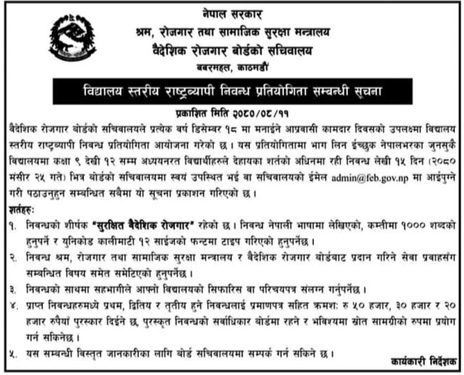 वैदेशिक रोजगार बोर्ड सचिवालयले बिगतका वर्षहरुमा झैं यस वर्षको डिसेम्बर १८ मा आप्रबासी कामदार दिवसको उपलक्ष्यमा कक्षा ९ देखि कक्षा १२ सम्मका विद्यार्थीलाई सहभागी गराई विद्यालयस्तरीय राष्ट्रव्यापी निबन्ध प्रतियोगिता गर्दैछ । यो प्रतियोगितामा प्राप्त भएका निबन्धहरु मध्ये प्रथम, द्वितीय र तृतीय हुनेले प्रमाणपत्र सहित क्रमशः रु.५०,०००, रु.३०,००० र रु.२०,००० नगद पुरस्कार प्राप्त गर्ने जनाइएको छ । प्रतियोगितामा सहभागी हसने निबन्ध यही मंसिर २५ गतेसम्ममा प्राप्त भइसक्नु पर्ने उक्त बोर्डको भनाइ छ ।