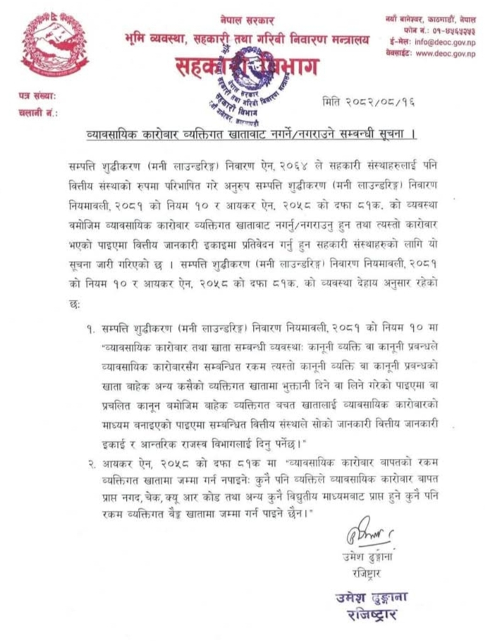 सहकारी विभागले व्यक्तिगत खाताबाट सहकारीको कारोबार नगर्न नगराउन सहकारी संघ संस्थाहरुलाई निर्देशन गरेको छ । मंगलबार सूचना जारी गरि सहकारी विभागले सो निर्देशन गरेको हो