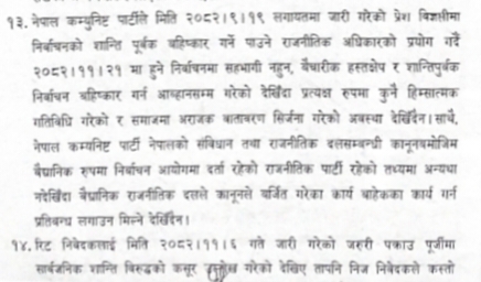 सर्वोच्च अदालतले शान्तिपूर्वक निर्वाचन बहिस्र्कार गर्न पाउने राजनीतिक अधिकार भएको व्याख्या गरेको छ । थुनामा रहेका नेपाल कम्युनिष्ट पार्टीका अध्यक्ष ऋषिराम कट्टेललाई विना कारण गैरकानूनी रुपमा पक्राउ गरि थुनामा राखेकाले उहाँलाई थुना मुक्त गर्न माग गरि अधिवक्ता रुपेश कट्टेलले दायर गर्नु भएको रिटमाथि सुनुवाई गरी मंगलबार सर्वोच्च अदालतका न्यायधीशद्वय हरि फुयल र टेकप्रसाद ढुंगानाको संयुक्त इजालासले नेपाल कम्युनिष्ट पार्टीका अध्यक्ष ऋषिराम कट्टेललाई थुना मुक्त गर्न आदेश गरेको फैसलामा सो विषय उल्लेख छ । उक्त रिटमाथि बहस गर्ने क्रममा शान्तिपूर्वक निर्वाचन बहिस्कार गर्न पाउनु नागरिकको अधिकार भएको विषयलाई अधिवक्ता फडिन्द्र कार्की लगायतले महत्वका साथ उठाएका थिए ।