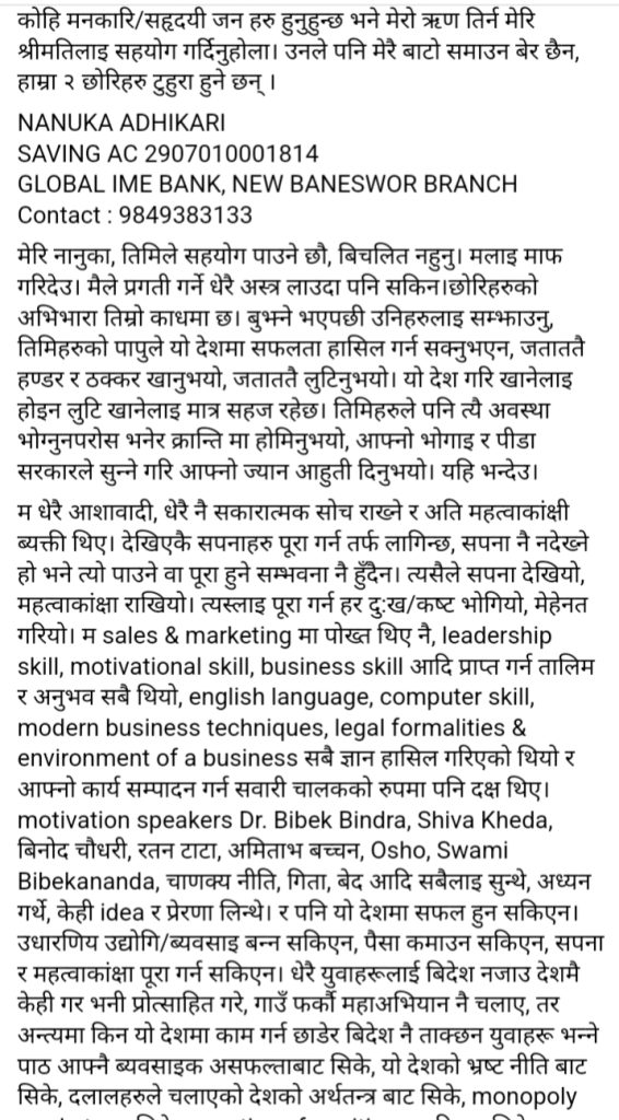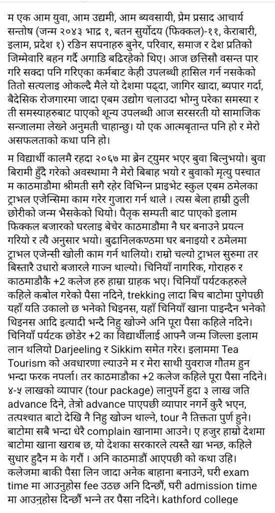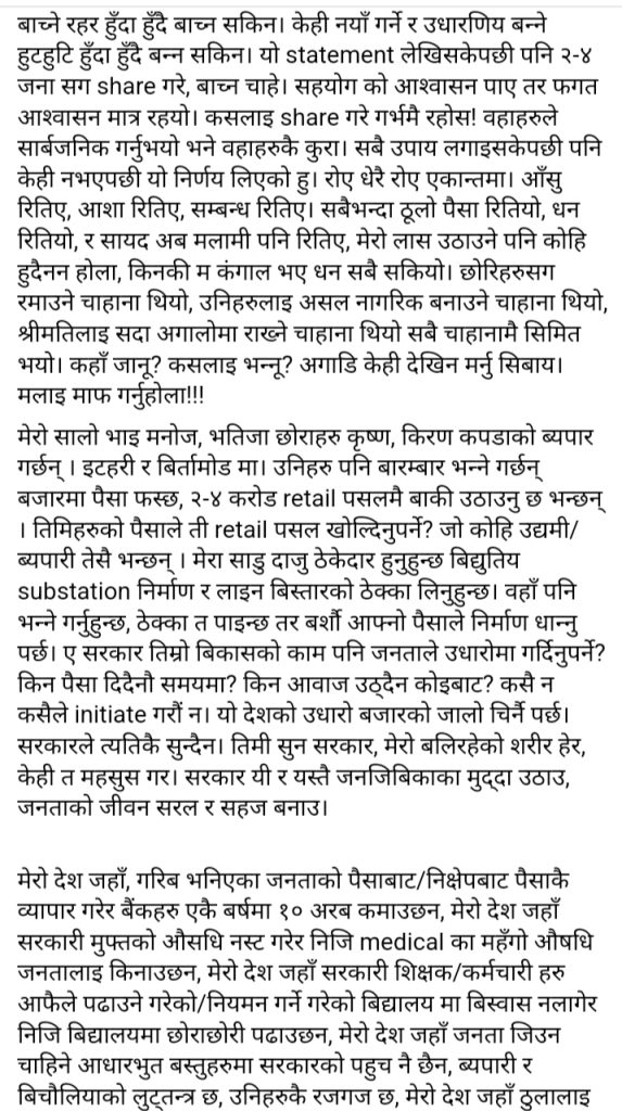 आत्मदाहको प्रयास गर्नुअघि उनले आफ्नो फेसबुकमा ‘ लामो स्टाटस पोस्ट’ गरेका थिए । जो यस प्रकार छ ।