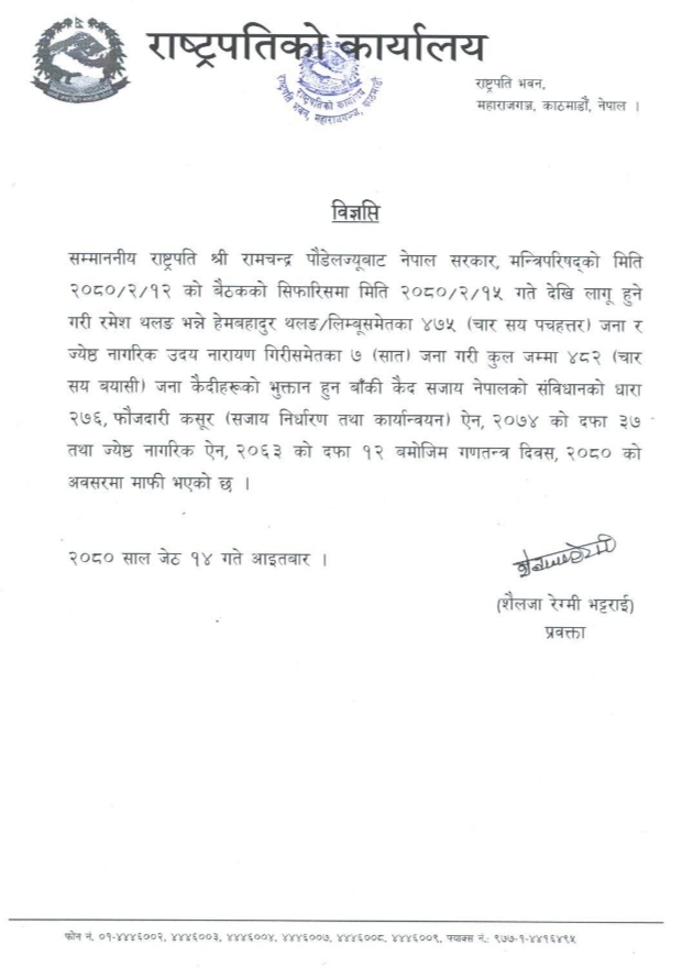 नेपाल सरकार, मन्त्रीपरिषदको सिफारिसमा गणतन्त्र दिवसको अवसरमा राष्ट्रपति रामचन्द्र पौडेलबाट १४ वर्ष ९ महिनाकोलकैद माफी मिनाह भएपछि ५ वर्ष ३ महिनाको कैदी जीवनबाट नागरिक उन्मुक्ति पार्टीका संरक्षक तथा पूर्व सांसद रेशमलाल चौधरी सोमबार रिहा हुने भएका छन् । दाङ, कैलाली, कञ्चनपुर, बाँके र बर्दियाका षारु बहुल क्षेत्रलाई मिलाएर थारुवान थरुहट प्रदेश बनाउनु पर्ने माग राखेर भएको संघर्को क्रममा १ नावालक र प्रहरी सहित ८ जनाको ज्यान गएको थियो । त्यसै घटनामा दोषी ठहर गर्दै उनी सहित केहीलाई तीनै तहका अदालतले जन्मकैदको फैसला गरेका थिए । यस पटक उनी सहित ४८२ जनालाई आम माफी दिने निर्णय भएको जनाइएको छ ।