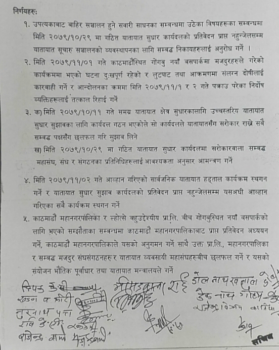 आज बिहान ९ बजेदेखि सिंहदरवारस्थित भौतिक पूर्वाधार तथा यातायात मन्त्रालयमा सरकार र १० सुत्रीय माग पूरा गराउन आन्दोलनमा उत्रिएका मजदूर संंगठनका प्रतिनिधि बीचको छलफलबाट ५ बुँदे सहमती भएको छ । बैठक सकारात्मक ढंगबाट अगाडि बढेकाले आन्दोलनरत मजदूर संगठनहरुले आज गरेको यातायात बन्द कार्यक्रम स्थगन गरेका थिए । सो छलफलबाट निम्नानुसारका सहमती गर्ने निर्णय भएको छ ।