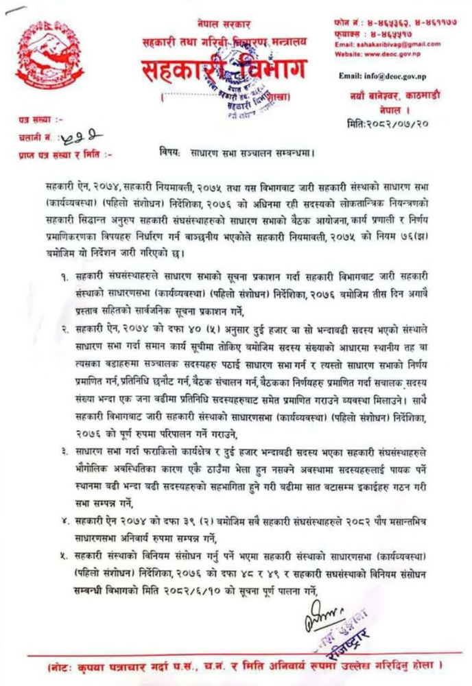 सहकारी विभागले सहकारी संघ संस्थाहरुलाई ७ बुँदे निर्देशन जारी गरेक‍ छ । सहकारी विभागले जारी गरेको सो निर्देशन सहकारी संघ संस्थाहरुको वार्षिक साधारण सभाको विषयमा रहेको छ ।