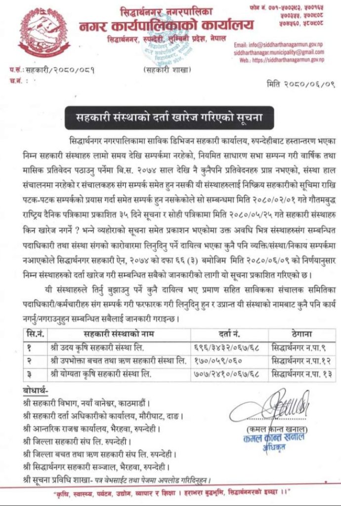 रुपन्देहीको सिद्धार्थनगर नगरपालिकाले लामो समयदेखि सम्पर्क विहीन रहेका ३ वटा सहकारी संस्था खारेज गरेको जनाएको छ । सो नगरपालिकाले आज जारी गरेको सूचनामा श्री उदय कृषि सहकारी संंस्था लि., श्री उपभोक्ता बचत तथा ऋण सहकारी संस्था लि. र श्री योग्यता कृषि सहकारी संस्था लि.को दर्ता खारेज गरेको उल्लेख छ ।