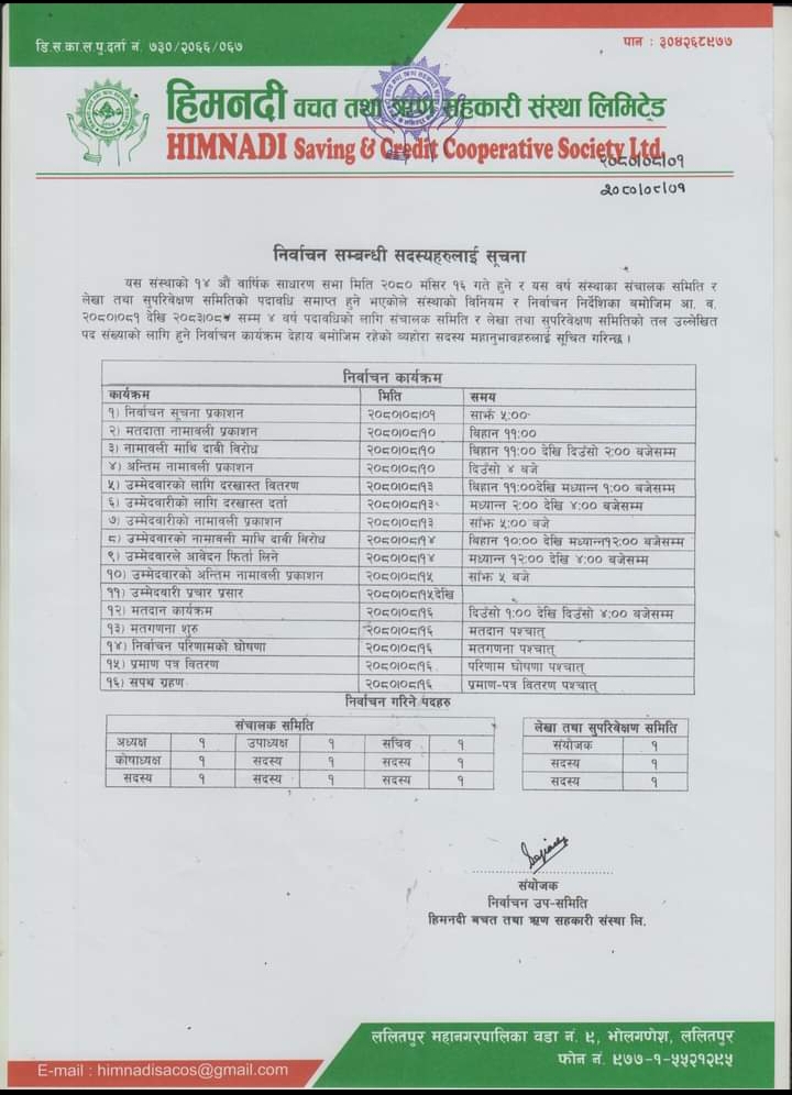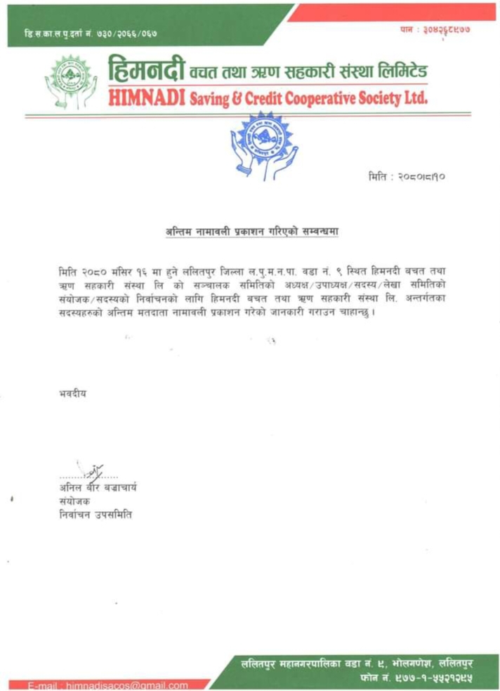 ललितपुरको भोलागणेशमा रहेको हिमनदी बचत तथा ऋण सहकारी संस्था लि.को ५औँ अधिवेशन सहित १४औँ वार्षिक साधारण सभा २०८० मंसिर १६ गते शनिबार विहान १० बजे ललितपुुुरको भोलढोकास्थित ज्यापू समाज प्रज्ञा भवनमा हुने भएको छ । सो साधारण सभाको सांसद प्रेमबहादुर महर्जनले उद्घाटन गर्ने कार्यक्रम रहेको सोही संंस्थाका प्रमुख कार्यकारी अधिकृत अशोक घिमिरेले अलगपथलाई बताउनुभयो ।