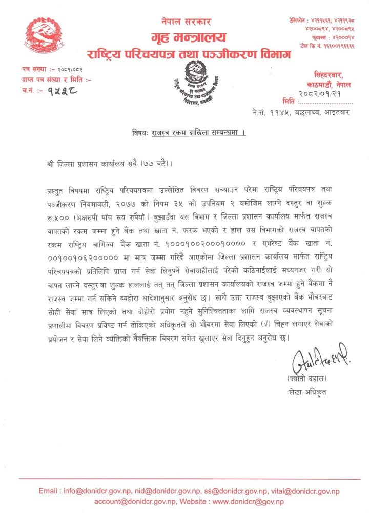 राष्ट्रिय परिचयपत्रको त्रुटी ५०० रुपैया तिरेर सच्याउन सकिने भएको छ । राष्ट्रिय परिचयपत्र तथा पञ्जीकरण विभागले ७७ वटै जिल्ला प्रशासन कार्यालयलाई पठाएको पत्रमा तत् तत् जिल्ला प्रशासन कार्यालयको राजस्व जम्मा हुने बैंकमा बैंक भौचर भरी राजस्व जम्मा गरेर स कनर्य गर्न सकिने जनाइएको छ ।
