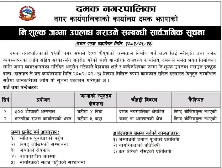 दमक नगरपालिकाले ३०० शैय्याको दमक अस्पतााल निर्माणको लागि नि:शुल्क जग्गा दिन इच्छुक दाताहरुलाई अनुरोध गरेको छ । दमक नगरपालिकाले सूचना प्रकाशित गरि सो अनुरोध गरेको हो ।