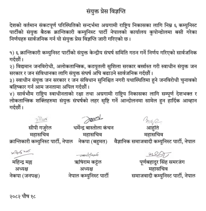 आउदो फाल्गुण २१ गते हुने तय भएको प्रतिनिधि सभा निर्वाचन बहिस्कार गर् ६ कम्युनिष्ट पार्टीले अपील गरेका छन् । शुक्रबार क्रान्तिकारी कम्युनिष्ट पार्टी नेपालको कार्यालय कुपण्डोल ललितपुरमा बसेको क्रान्तिकारी कम्युनिष्ट पार्टी नेपाल, नेपाल कम्युनिष्ट पार्टी, वैज्ञानिक समाजवादी कम्युनिष्ट पार्टी नेपाल, नेकपा (बहुमत), नेकपा (जनपक्ष) र समाजवादी कम्युनिष्ट पार्टीको संयुक्त बैठकले स्वाधिन संयुक्त जन-सरकार र जन-संविधान निर्माण हुने सुनिश्चित नभएसम्म हुने निर्वाचनले राजनीतिक निकास नदिने उनीहरुको ठहर छ ।