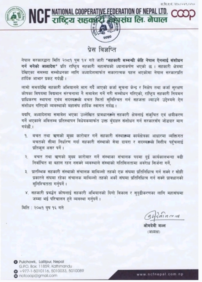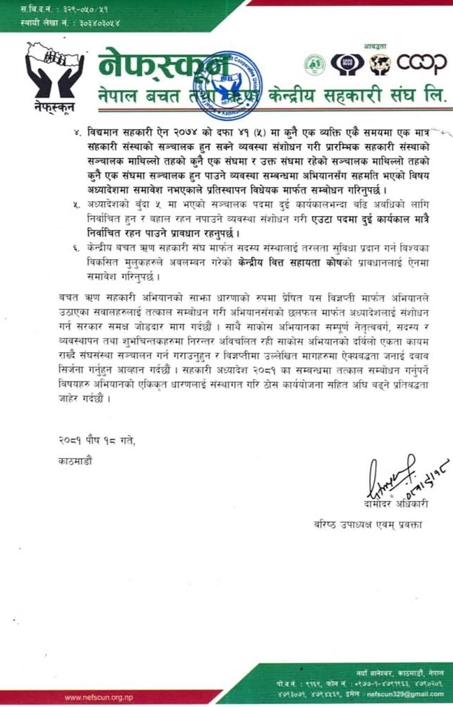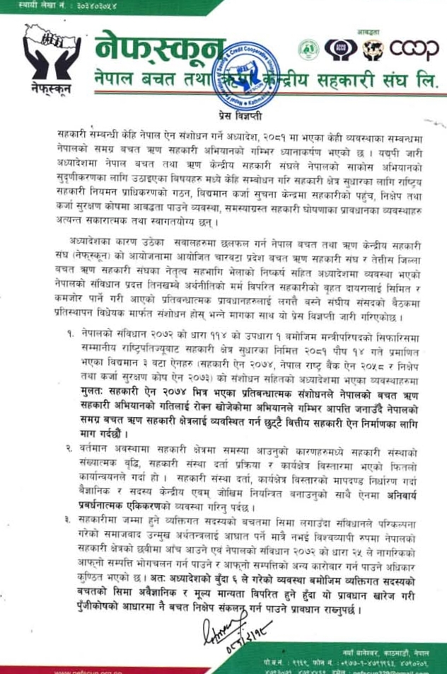 यता यही पुस १४ गते आइतबार नेपाल सरकार, मन्त्रीपरिषदको सिफारिसमा राष्ट्रपति रामचन्द्र पौडेलले जारी गरेको सहकारी सम्बन्धी ऐन संशोधन गर्ने अध्यादेशका केही बुँदा सच्याउन अनुरोध गर्दै नेफ्स्कूनले छुट्टै साकोस ऐन बनाउन माग गरेको छ ।