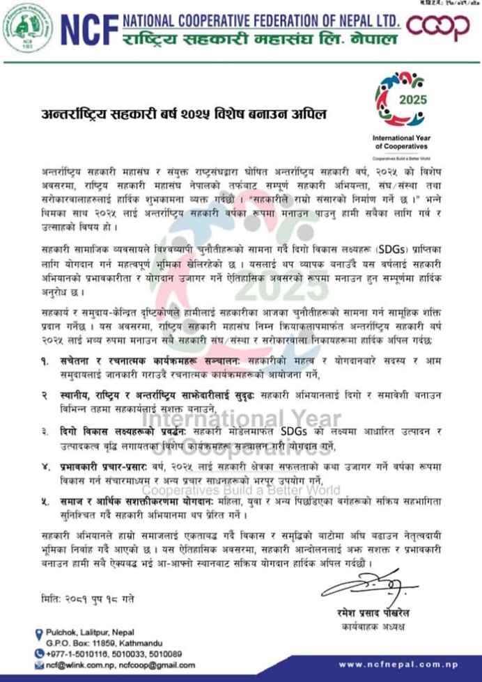राष्ट्रिय सहकारी महासंघ लि.,नेपालले अन्तर्राष्ट्रिय सहकारी वर्ष, २०२५ भव्य रुपमा मनाउन सहकारी संघ/संस्थाहरु, अचियन्ता र सरोकारवालाहरुलाई अपील गरेको छ । “सहकारीले राम्रो संसारको निर्माण गर्ने छ ।” भन्ने थीमका साथ सन् २०२५ लाई अन्तराष्ट्रिय सहकारी वर्षको रुपमा विशेष बनाउने योजना रहेको बताइएको छ ।